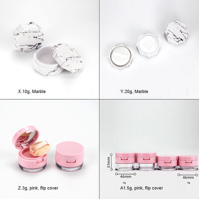 * Use to mix your own powder makeup;Suitable for loose powder, blush, foundation, etc * Perfect for table top, dressing table, suitable for household use * Convenient, hinged cover, with mirror, puff and elastic mesh sifter * Capacity 20g |