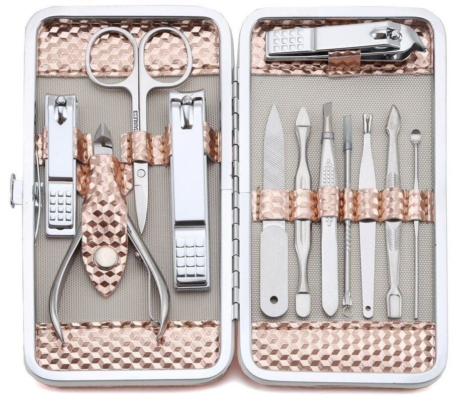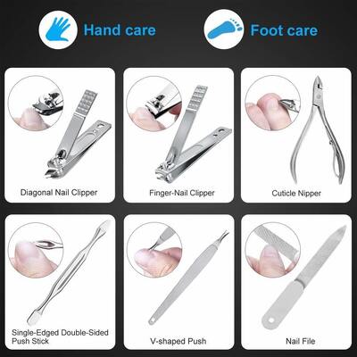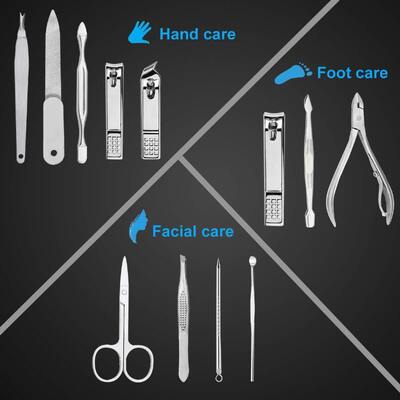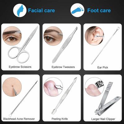 1 * Toenail Nail Clipper: Trim hard and thick toenails 1 * Cuticle Nipper: Trim cuticles 1 * Nail File: Make nails rounded,smooth 1 * Dead Skin Fork: Trim suface,agnail,callus,dead skin,etc 1 * Tweezer: pluck eyebrow and ingrown hairs 1 * Scissors: trim eyebrow 1 * Cuticle Pusher&Cutter: trim nail keratin and remove scrape nail polish 1 * Nail Cleaning Pusher: Cleaning dirt in nails 1 * Ear Pick: Ear cleaning 1 * Acne needle:Blackhead/Acne removing |